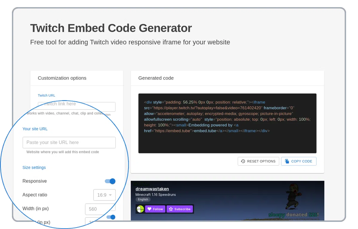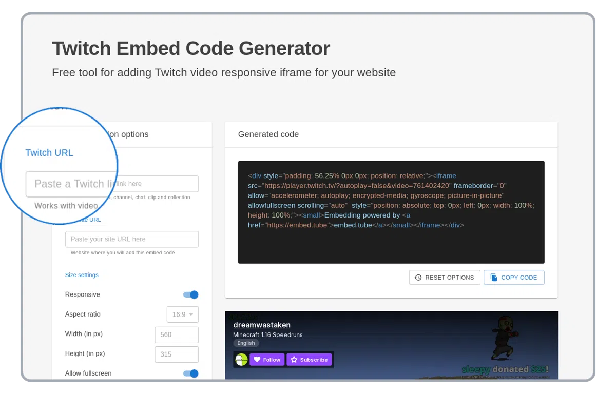 Pilihan "responsif" meregangkan video Twitch yang dibenamkan ke lebar penuh laman web atau bekas HTML.