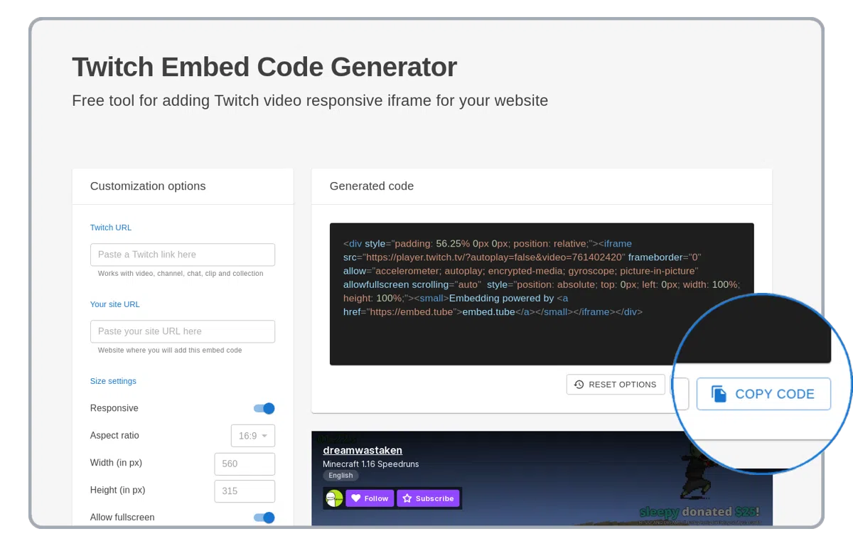 Salin kod benam HTML yang dijana dengan video Twitch! Gunakan ia di laman web WordPress anda, persembahan PowerPoint atau dalam e-mel.