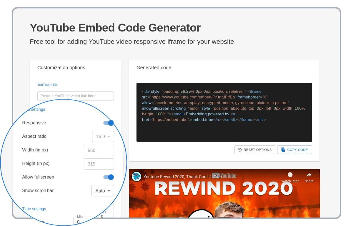 Pilihan "responsif" ngalebarkeun vidéo YouTube nu di-embed ka lebar pinuh situs web atanapi wadah HTML.